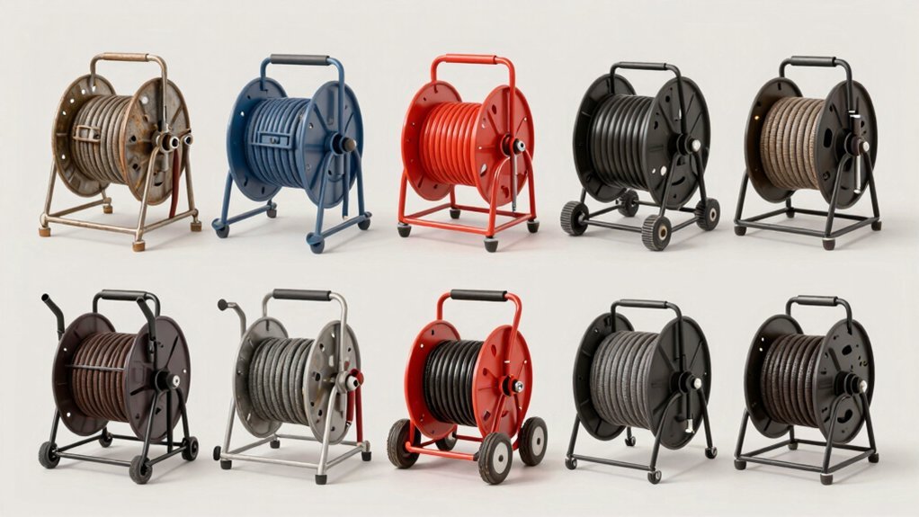 Wheeled hose reel carts offer flexibility you might appreciate. You’ll move them easily around your yard, positioning them wherever you need water access. This mobility eliminates permanent placement worries.